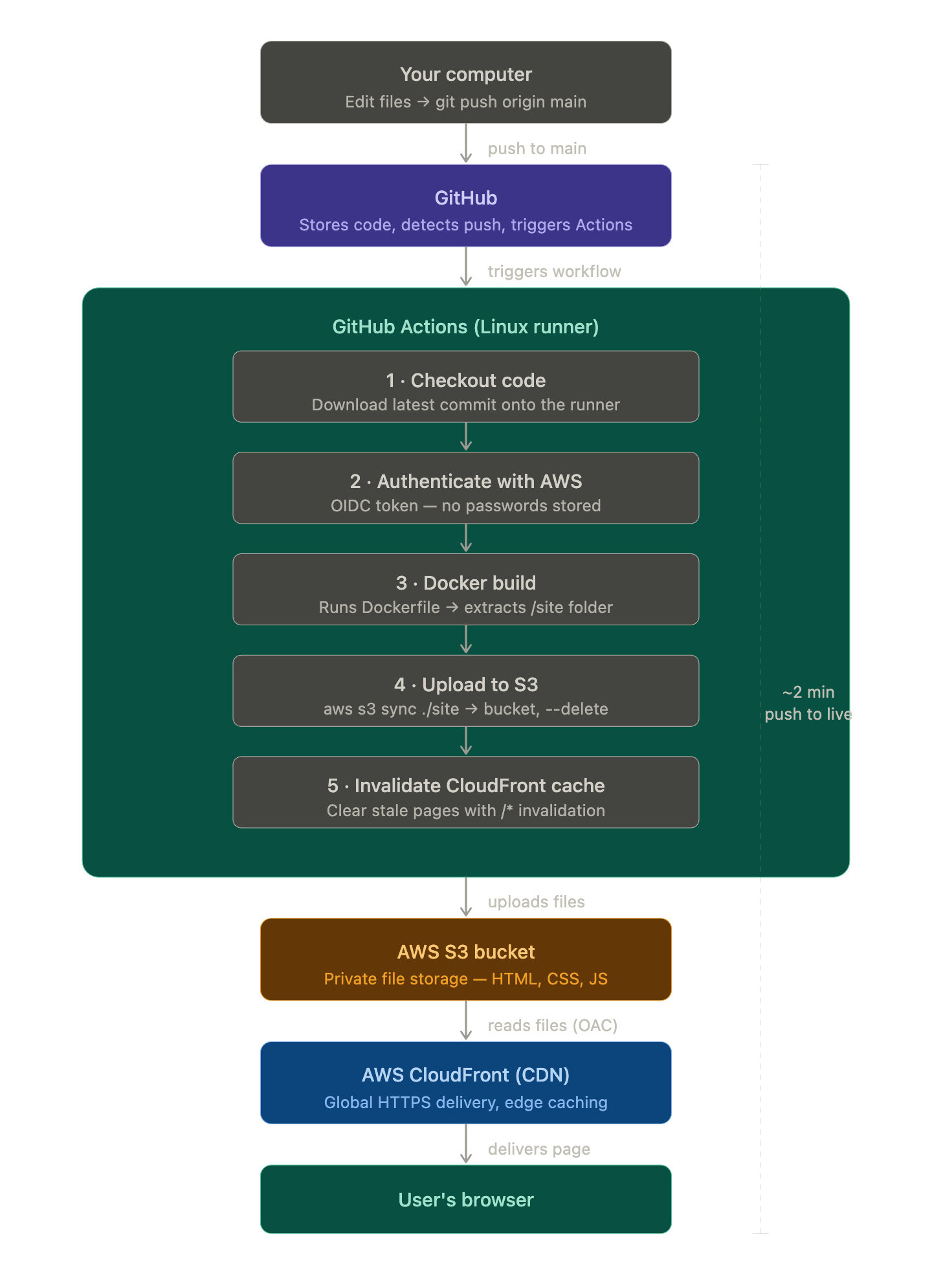 | Least-privilege IAM role | The deploy role can do exactly two things. Not "all of S3", not "all of CloudFront" — specifically this bucket and this distribution. If the credentials were somehow compromised, the blast radius is minimal. |